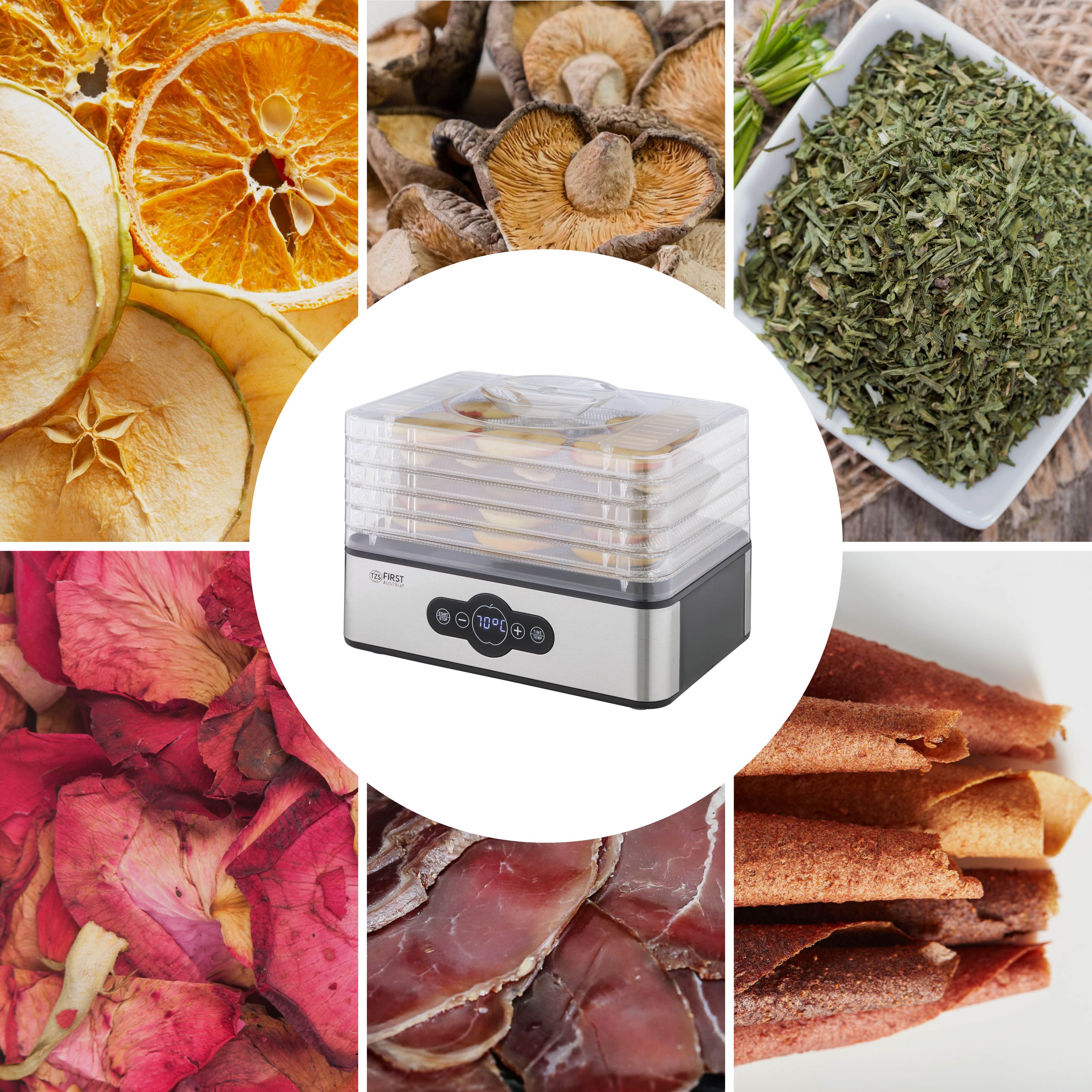 Die fünf Dörrtabletts sind aus BPA-freiem Kunststoff gefertigt und leicht zu reinigen. Sie können auf 5 Ebenen in 1,5 oder 2,7 cm Abständen gestapelt werden. Und wenn Sie eine kleinere Menge an Lebensmittel dörren wollen, lässt sich die Anzahl der Dörrtabletts ganz einfach anpassen.