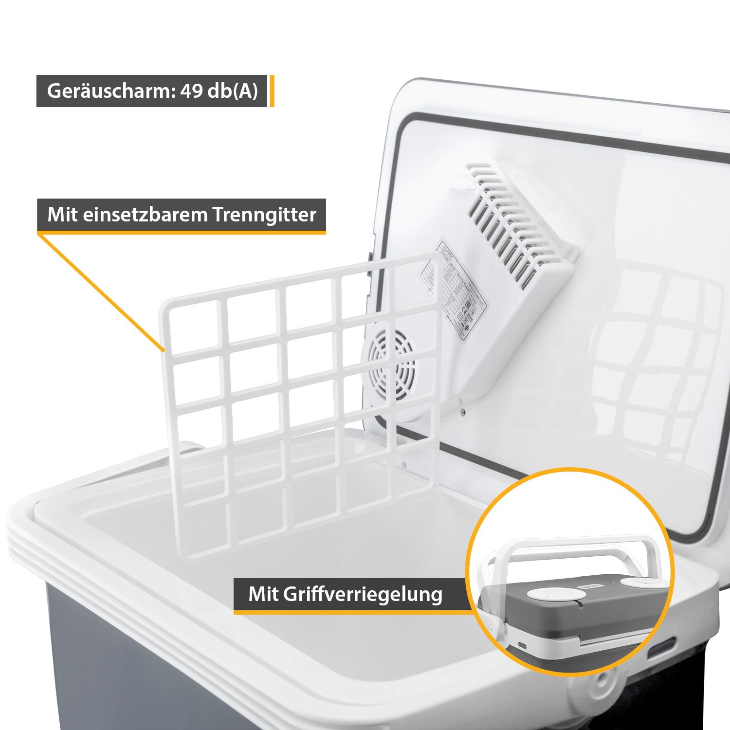Dank einem robustem Tragegriff ist die Kühlbox auch im gefüllten Zustand leicht zu transportieren. Das thermoisolierte Gehäuse ist aus strapazierfähigem Kunststoff gefertigt und steht sicher auf jedem Untergrund.