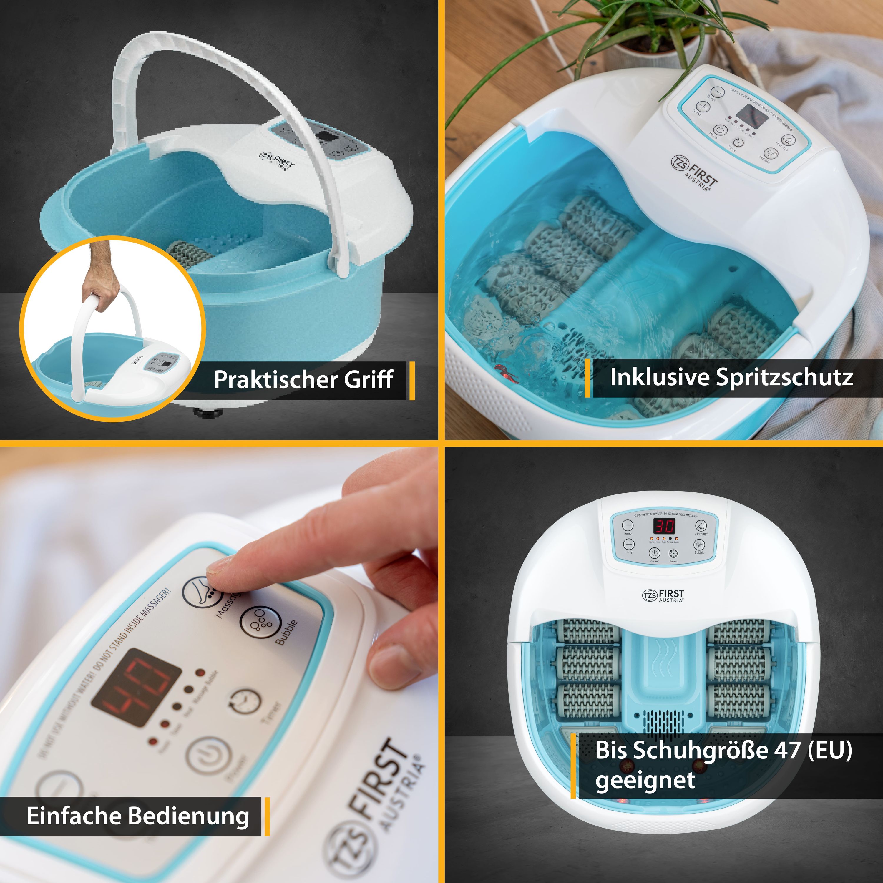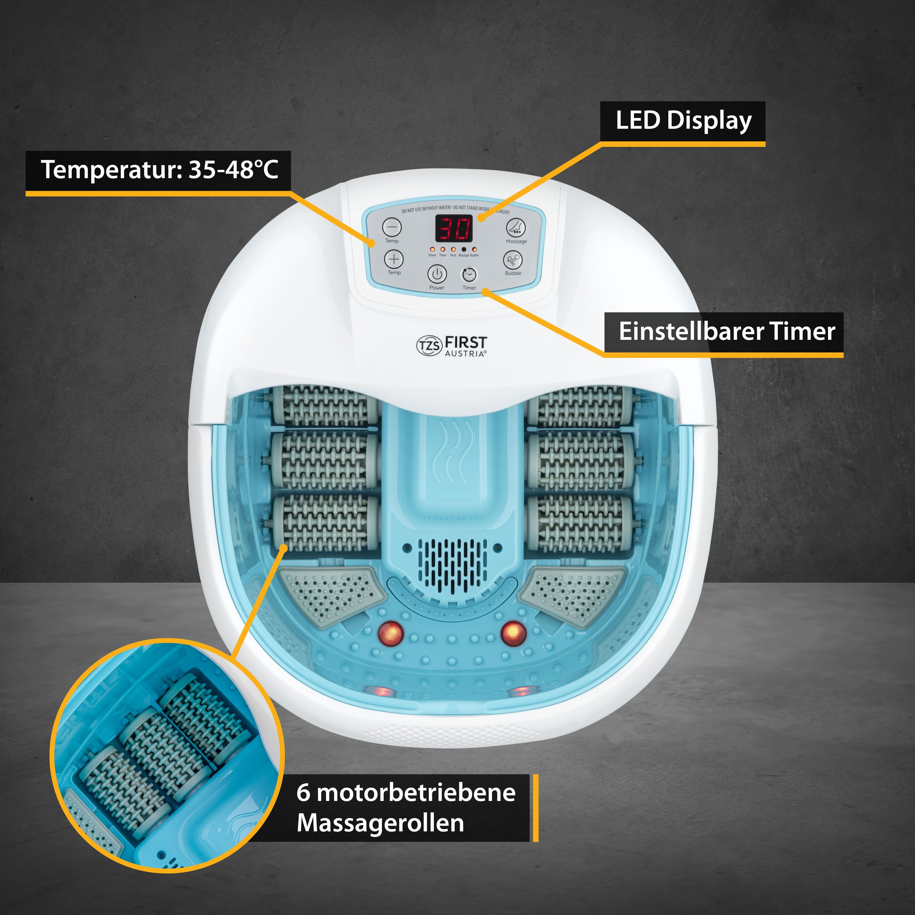 Stellen Sie Ihre gewünschte Temperatur ein (35-48°C) und schalten Sie je nach Wunsch Bubbles, Vibration und Infrarot-Licht dazu. Lehnen Sie sich zurück und vergessen Sie die Zeit. Ein einstellbarer Timer behält für Sie die Zeitdauer im Auge. 6 motorbetriebenen Massagerollen mit Noppen stimulieren die Fußreflexzonen und geben eine angenehme Massage. Das Fußsprudelbad fördert die Durchblutung, verringert den Stress und verbessert Ihren Schlaf.