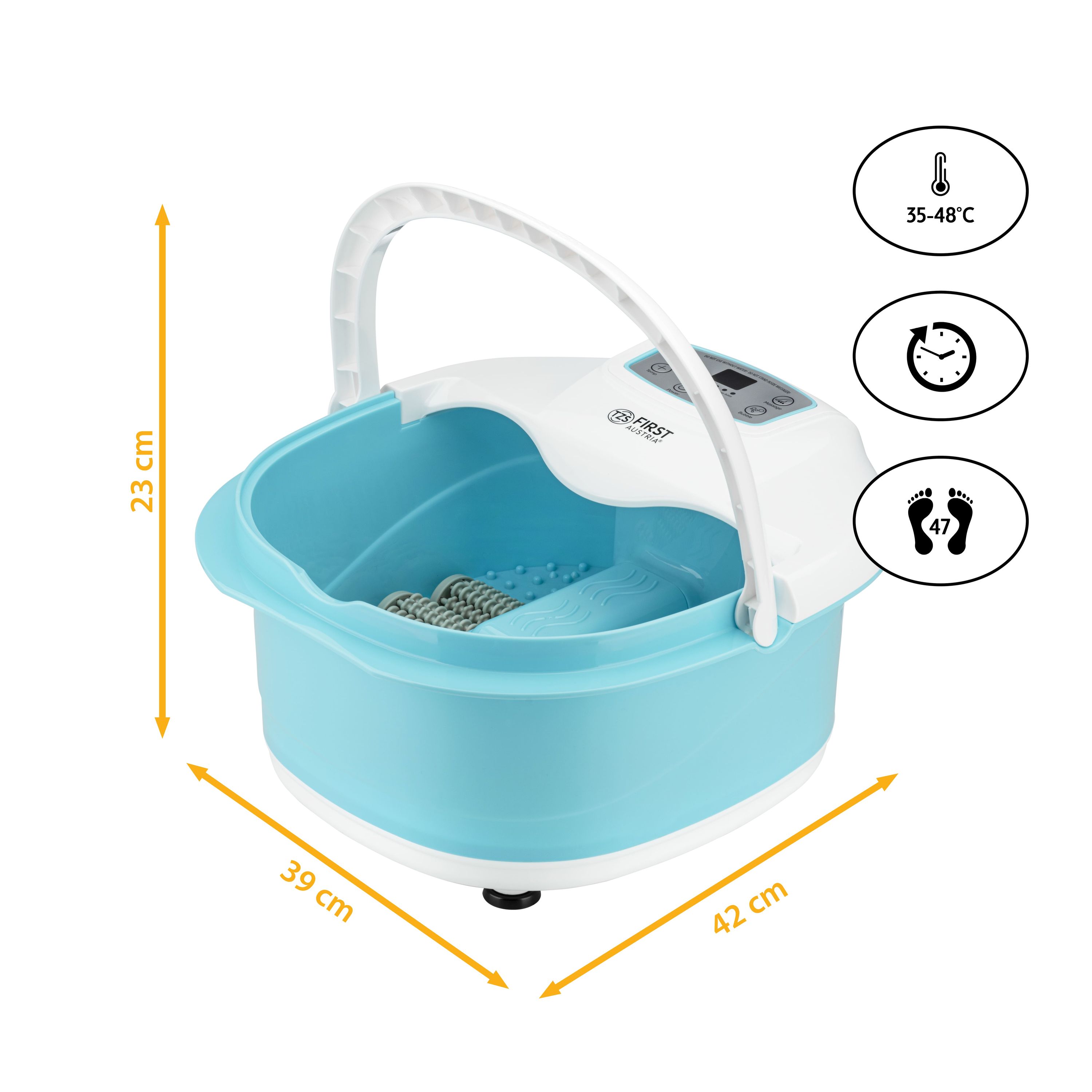 Intuitive Bedienung mittels Tasten und LED-Display. Das Fußbad ist ausgestattet mit einem praktischen Tragegriff, Heizfunktion und einem Spritzschutz. Das Becken mit 14,5 cm Tiefe ist für Schuhgröße bis zu 47 (EU) geeignet.