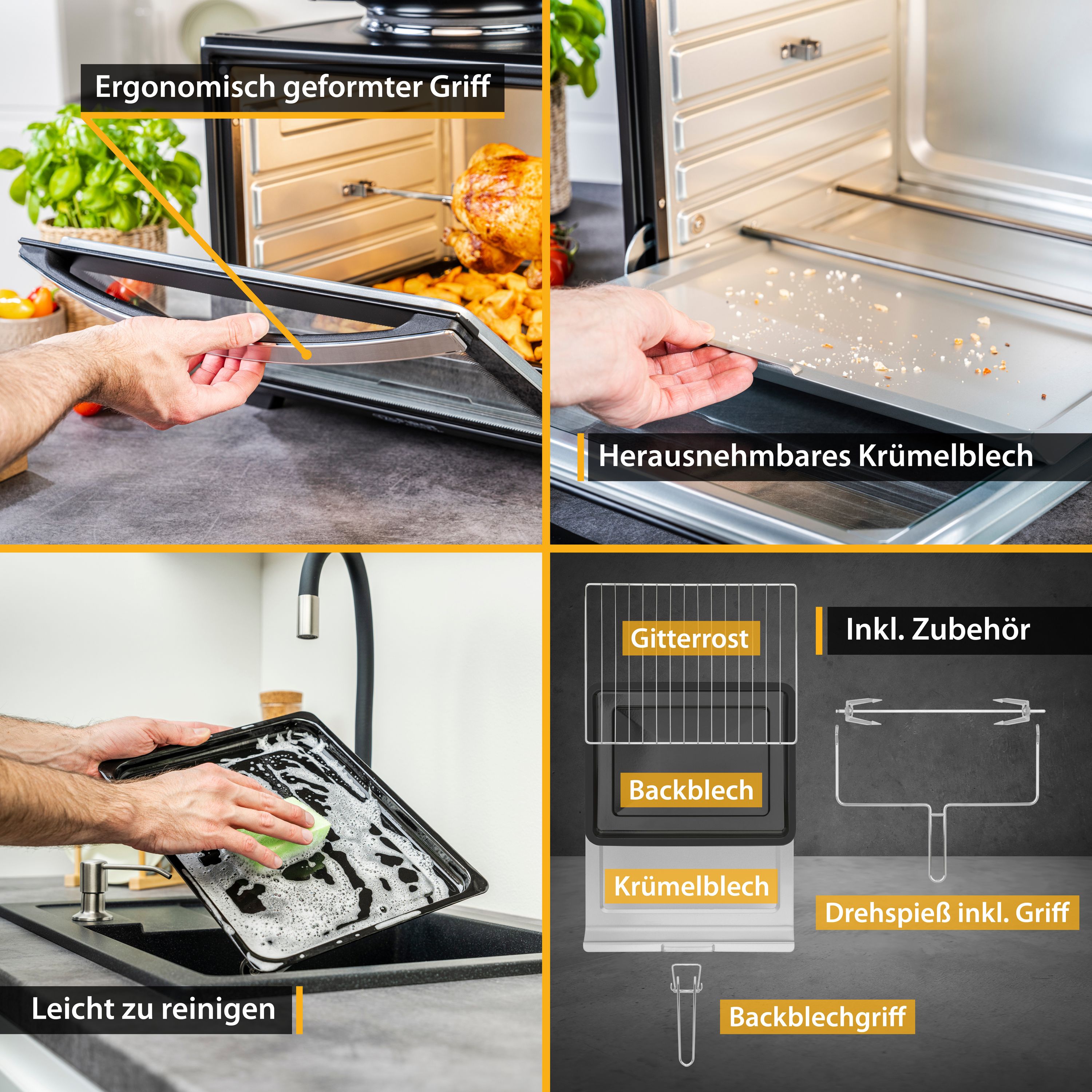 - 1x Minibackofen Grillgitter, 1x Backblech, 1x Krümelblech, 1x Drehspieß von TZS First Austria.