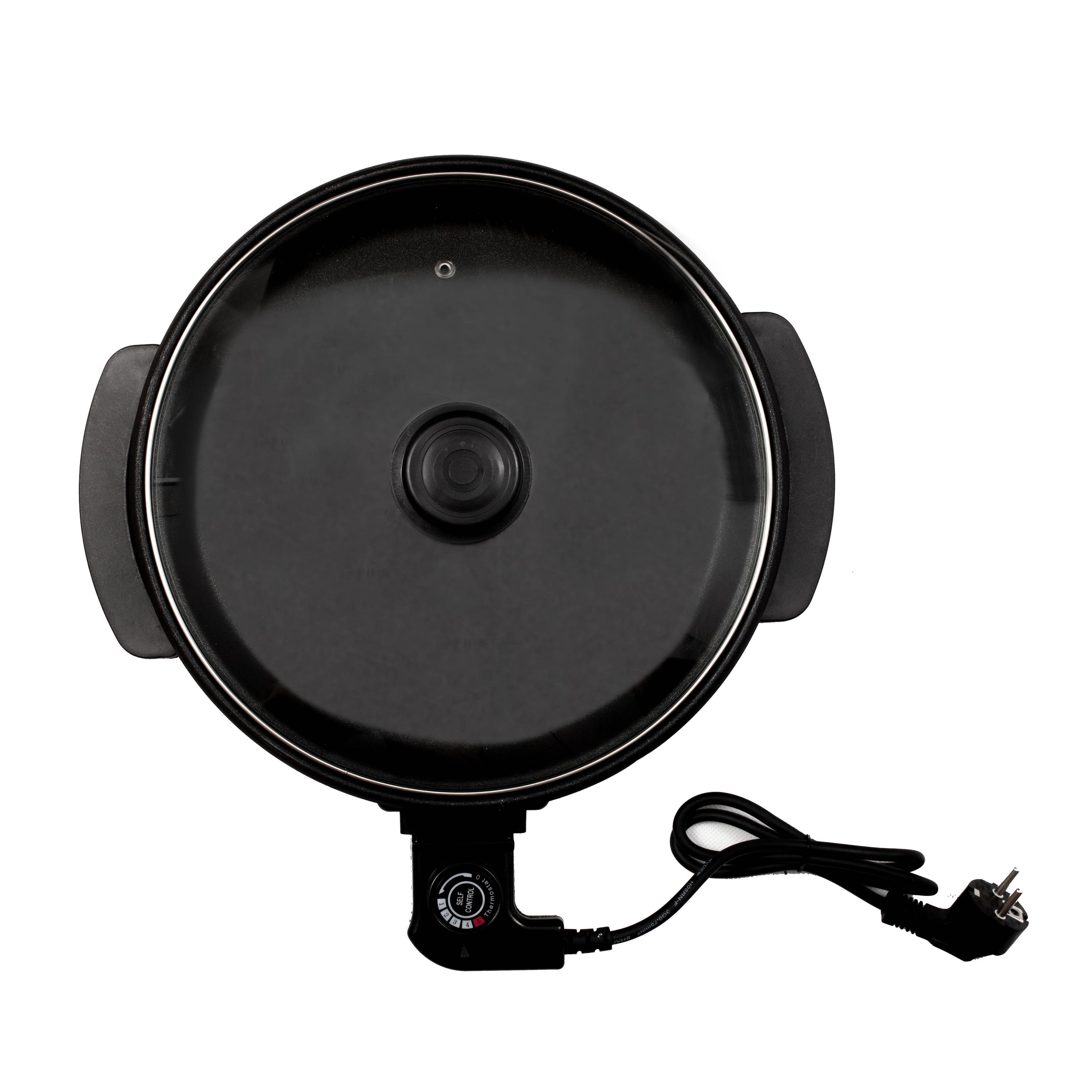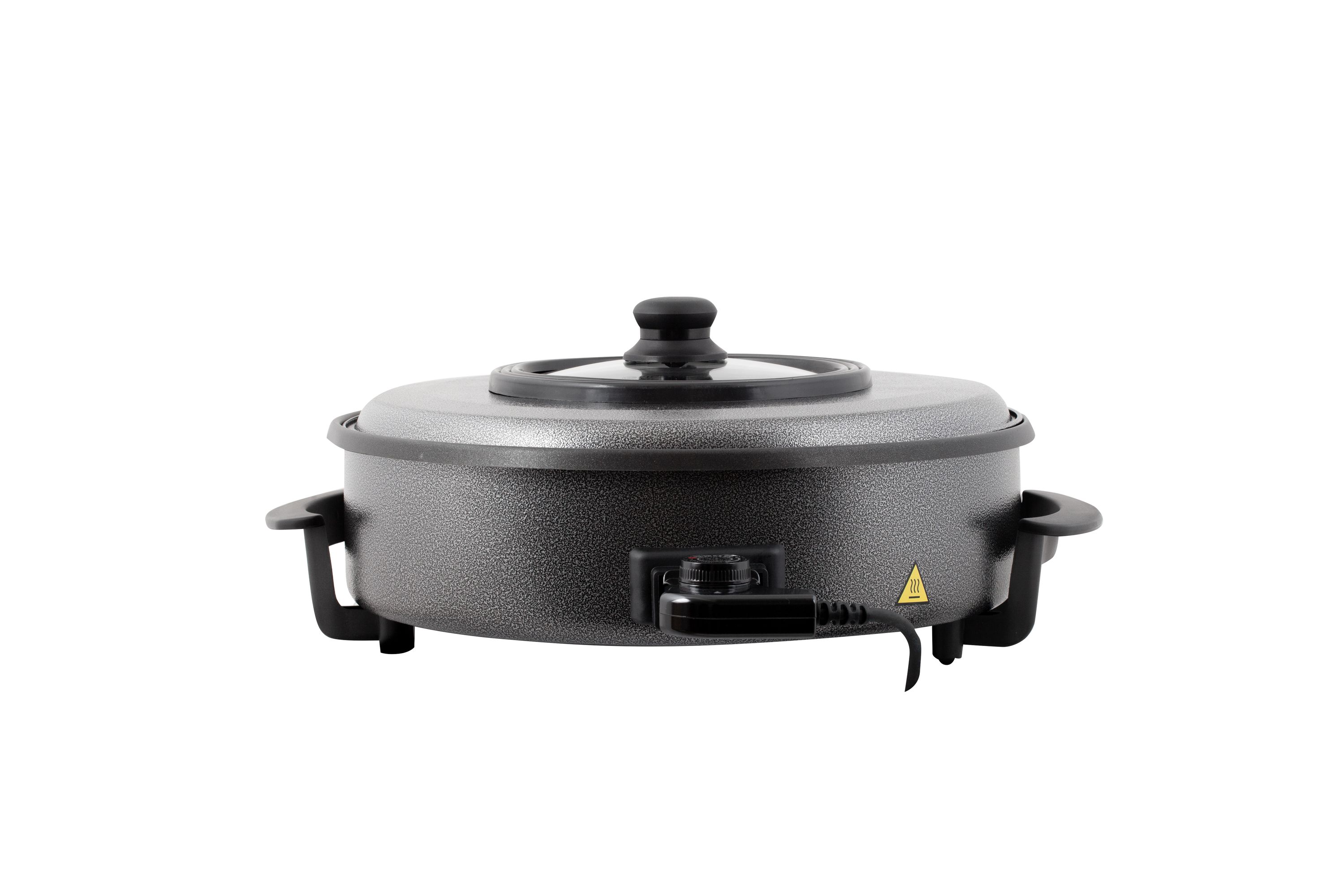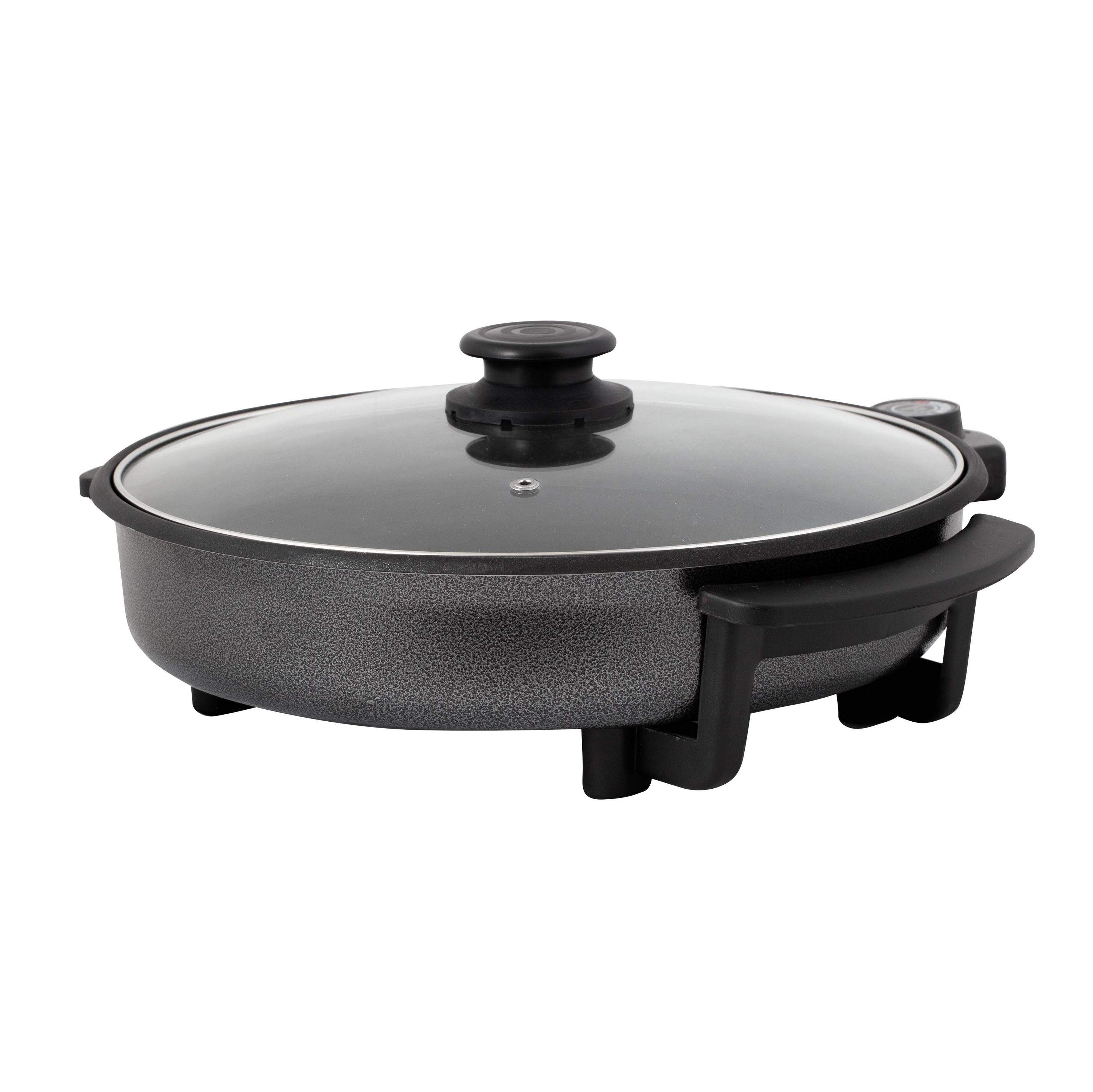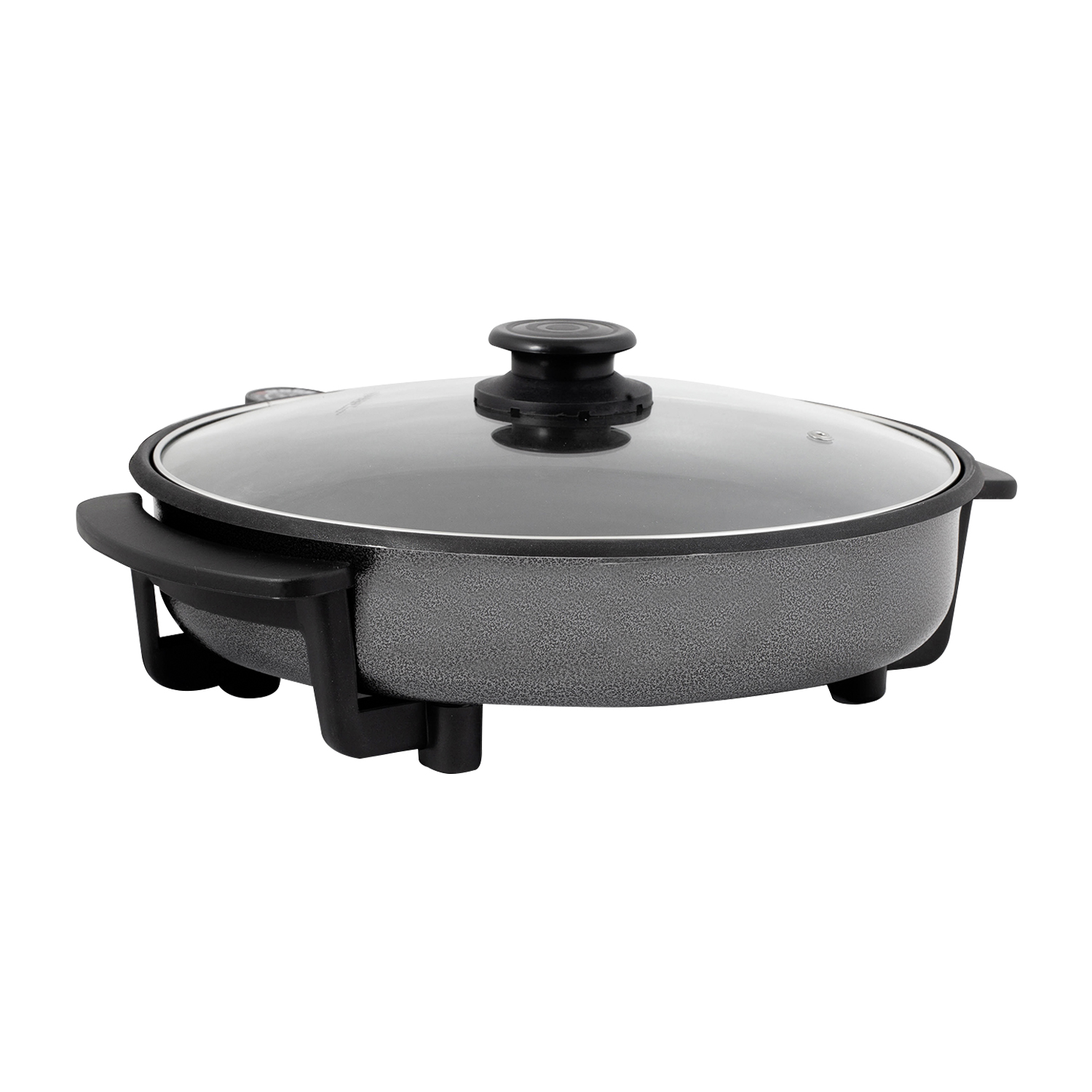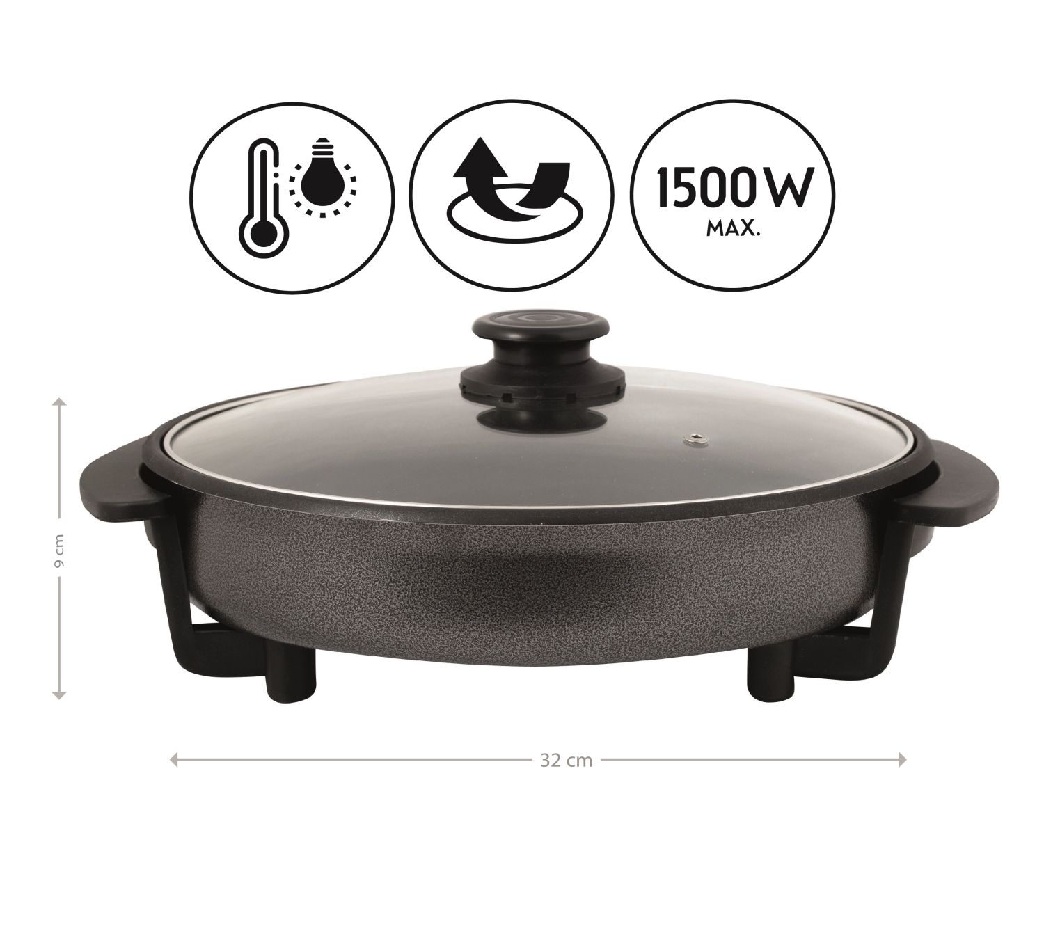 Mit der leistungsstarken Pizza Pfanne bereiten Sie die beste Pizza bequem Zuhause zu. Einfach die gewünschte Temperatur auf dem 5-stufigen Thermostat einstellen und sich ein gutes Gläschen Wein genehmigen. Durch den mitgelieferten Glasdeckel können Sie Ihrer Pizza entspannt beim Backen zusehen. Schon nach wenigen Minuten ist sie fertig und schmeckt wie aus dem traditionellen Steinofen.