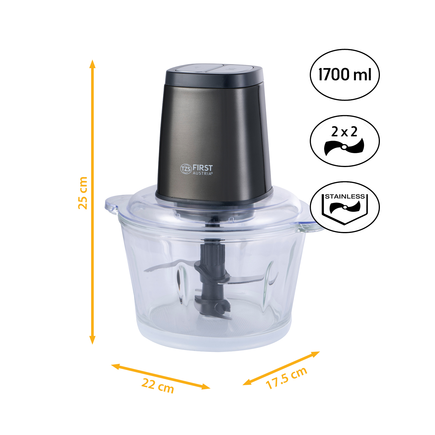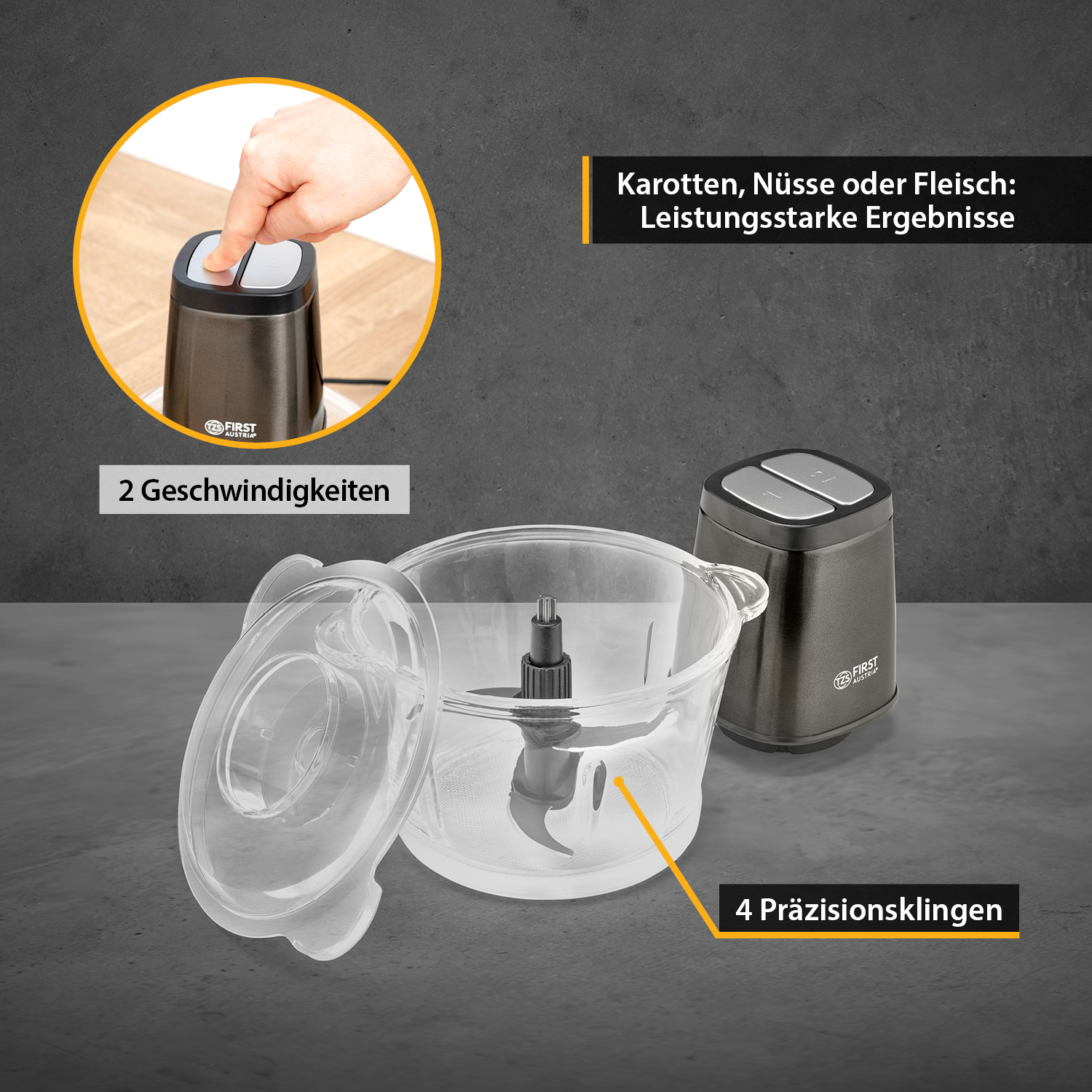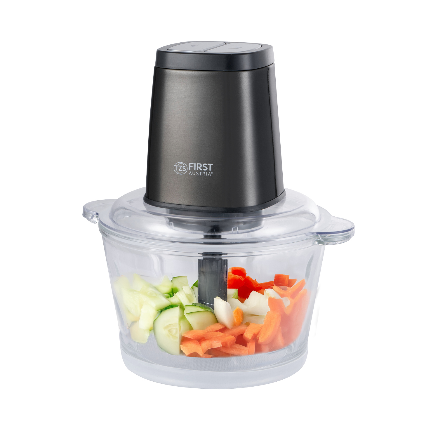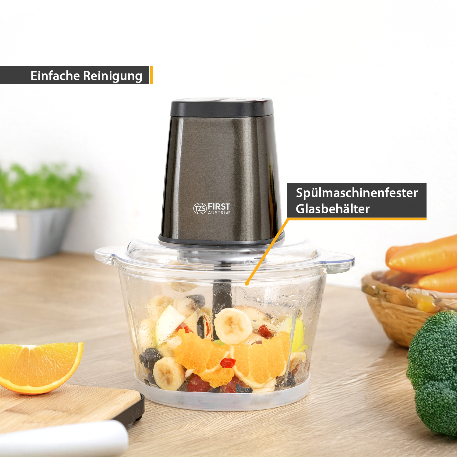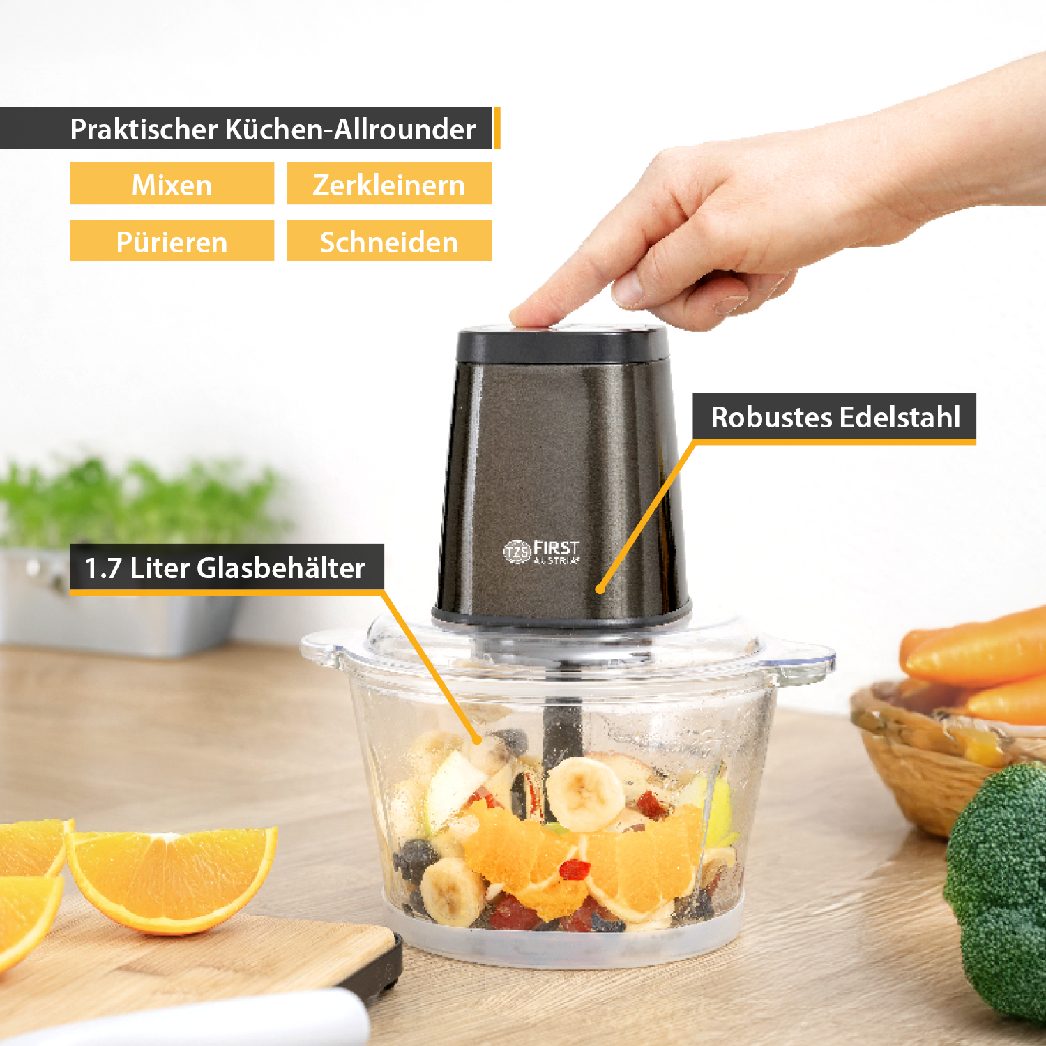 Der kraftvolle Zerkleinerer von TZS First Austria zerkleinert, mixt und hackt Ihre Lebensmittel im Handumdrehen. Sowohl weiche, als auch harte Lebensmittel wie Karotten, Tiefkühlobst und Nüsse werden präzise zerkleinert. Das ansprechende Design und die handliche Größe macht ihn zum unverzichtbaren Zubehör in Ihrer Küche.