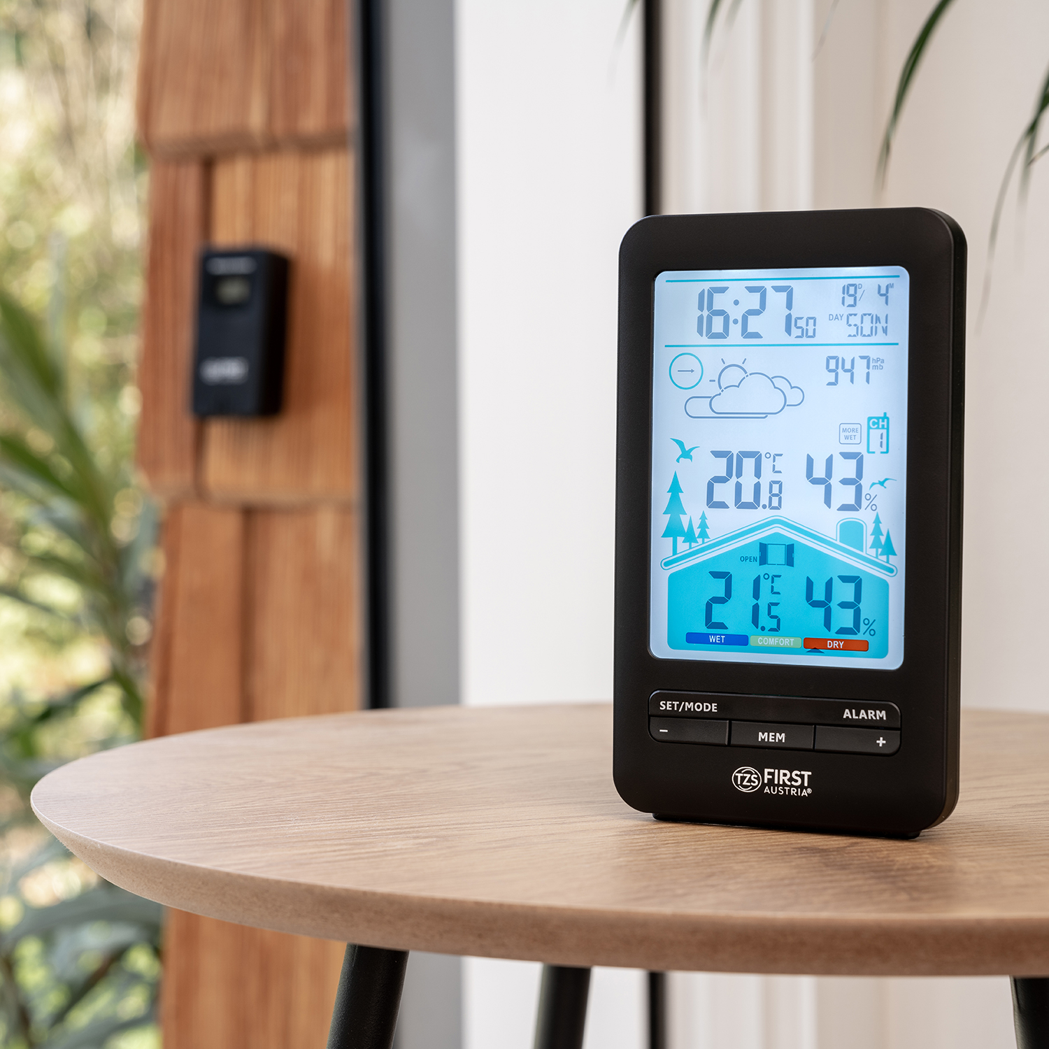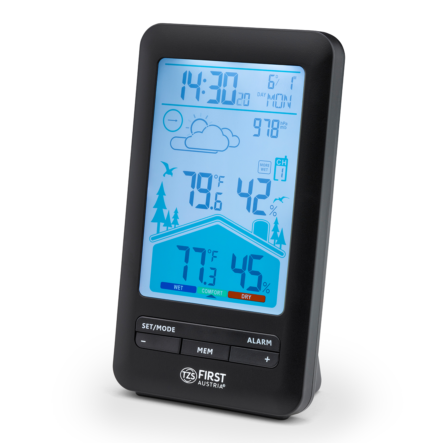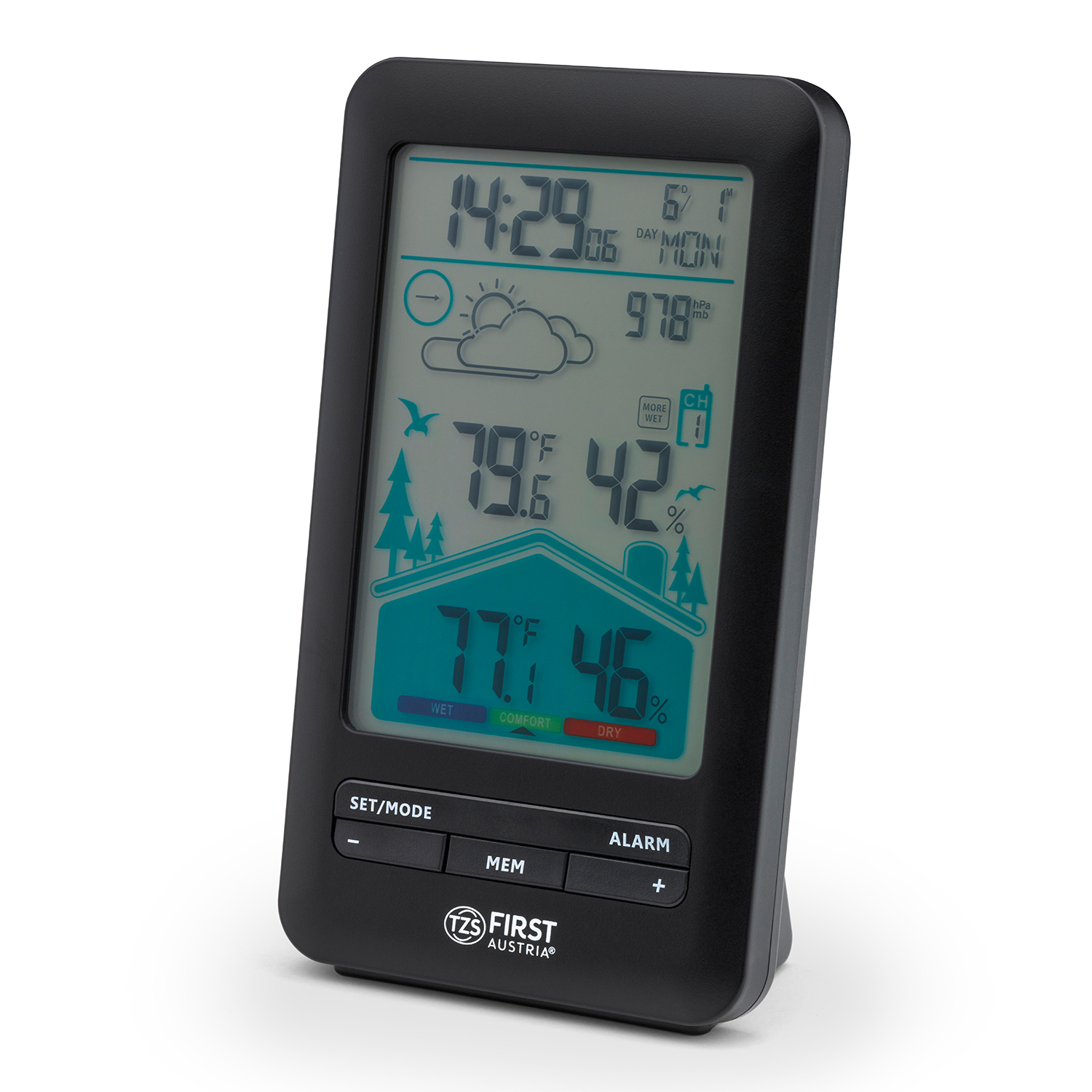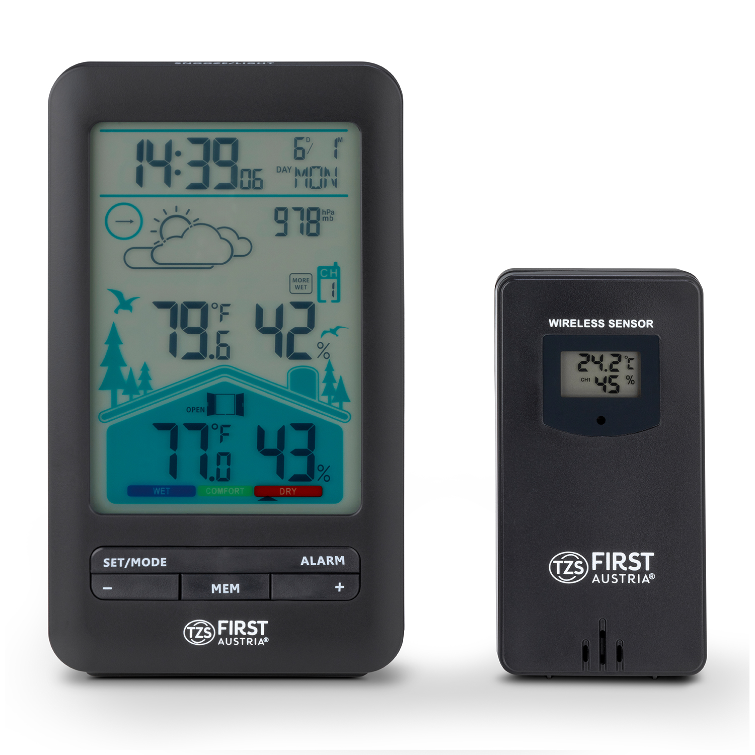 - Luftfeuchtigkeitsanzeige (in+out, 20 bis 95% RH, 24h min/max Aufzeichnung)