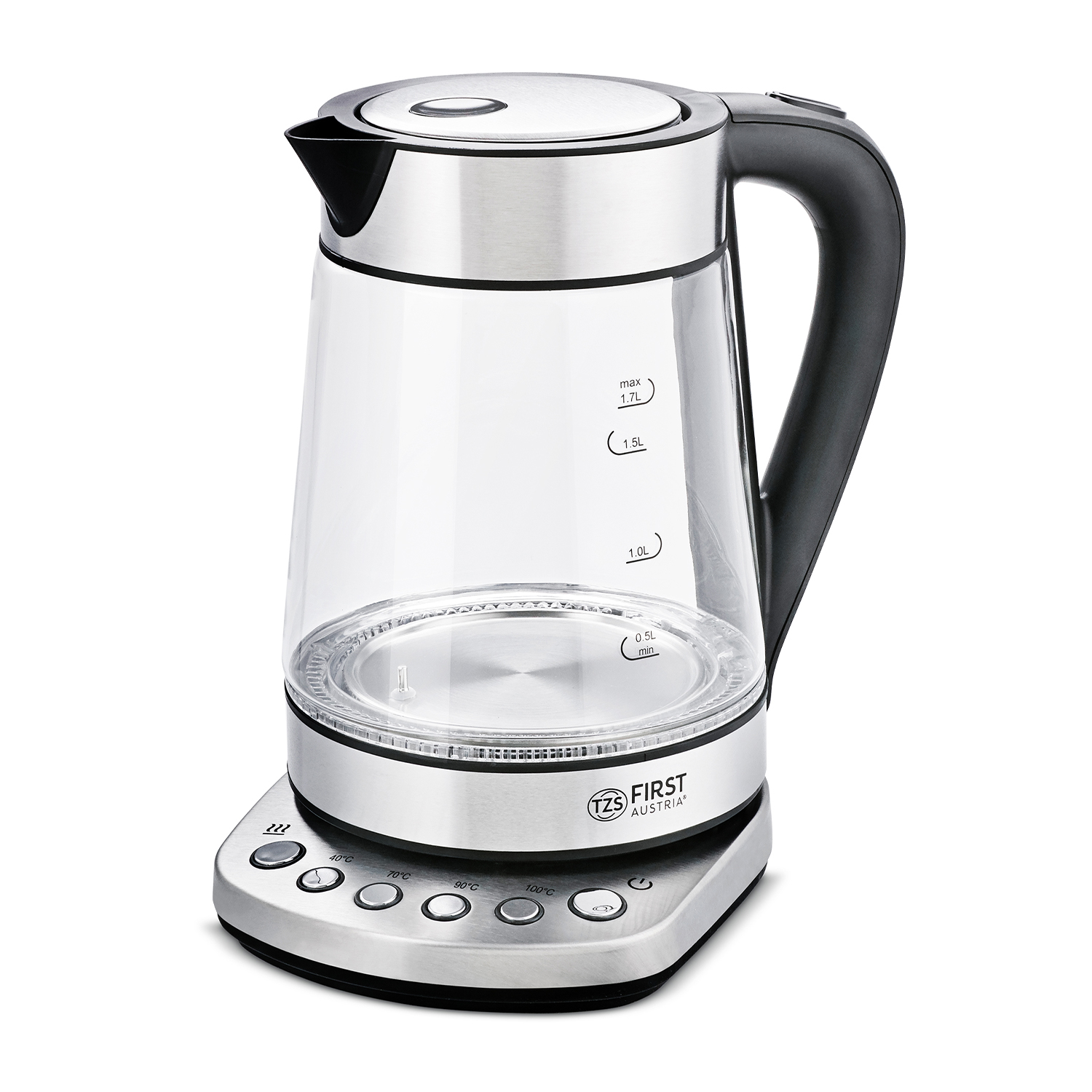 Siedendes Wasser ist nicht immer ein Muss: Der hochmoderne Wasserkocher mit dekorativen Elementen aus gebürstetem Edelstahl temperiert exakt nach Bedarf. Das spart Zeit und Energie, erhält aber auch Geschmack sowie Nährstoffe beim Aufguss. Dieser Glas-Wasserkocher von TSZ First Austria schafft eine besondere Atmosphäre durch eine bläuliche Beleuchtung und ein originelles und zeitloses Design und vor allem erwärmt er das Wasser in Rekordzeit. Zur Herstellung dieses Wasserkochers wurde hitzebeständiges Sicherheitsglas verwendet, das komplett geschmacksneutral ist.