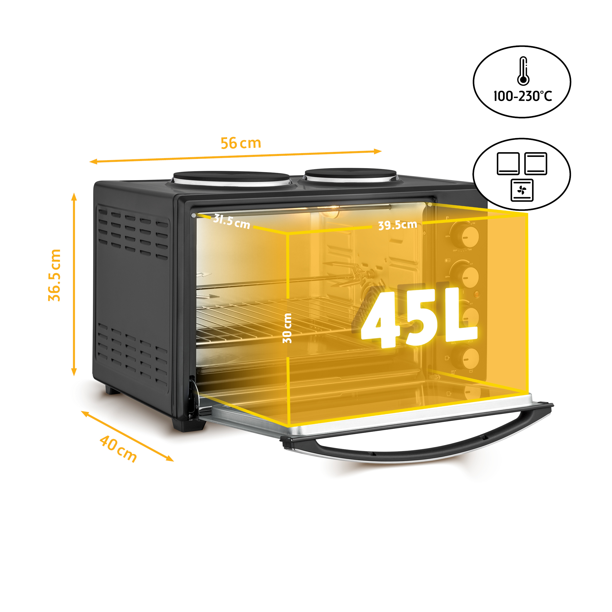 Mit 45 Litern Volumen und bis zu 230°C bietet der Ofen durch Konvektion gleichmäßige Ergebnisse. Zwei separat bedienbare Kochplatten (1000W und 600W) ermöglichen gleichzeitiges Kochen und Backen. Bereiten Sie Hauptgerichte im Ofen zu und Beilagen auf den Kochplatten.