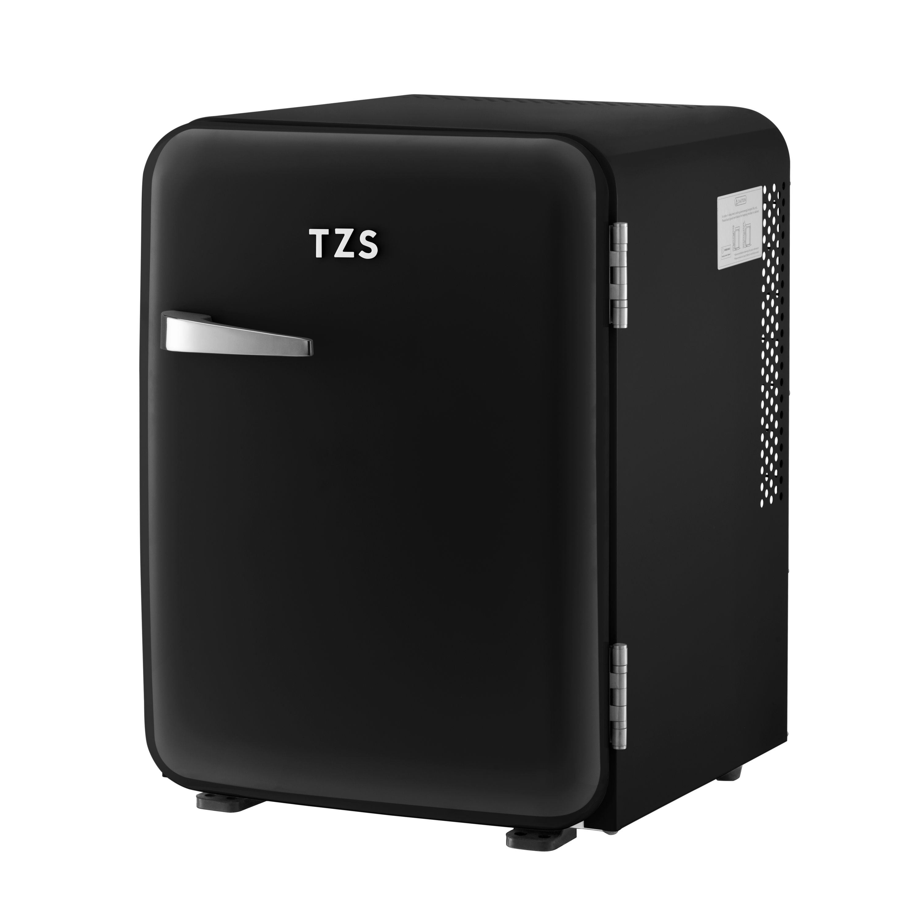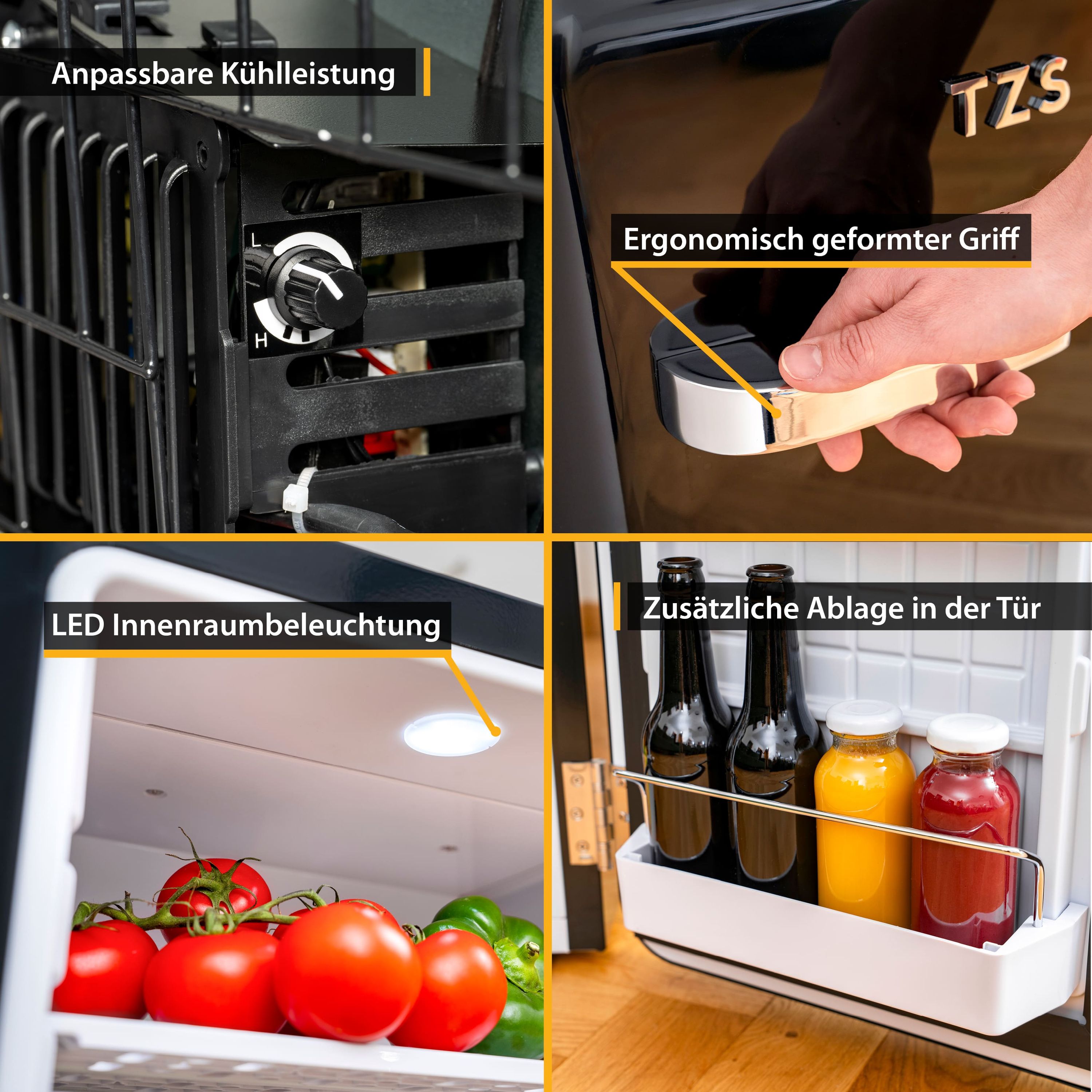 Zur Ausstattung gehören: eine Innenbeleuchtung, ein Kondenswassersammler, zwei verstellbare Türfächer und vier Kunststoffeinlegeböden zur flexiblen Nutzung. Das Highlight ist die absolut stylische Retro-Optik in unterschiedlichen Farben mit einem Hochglanz-Metall-Türgriff und dazu passenden TZS Logo.