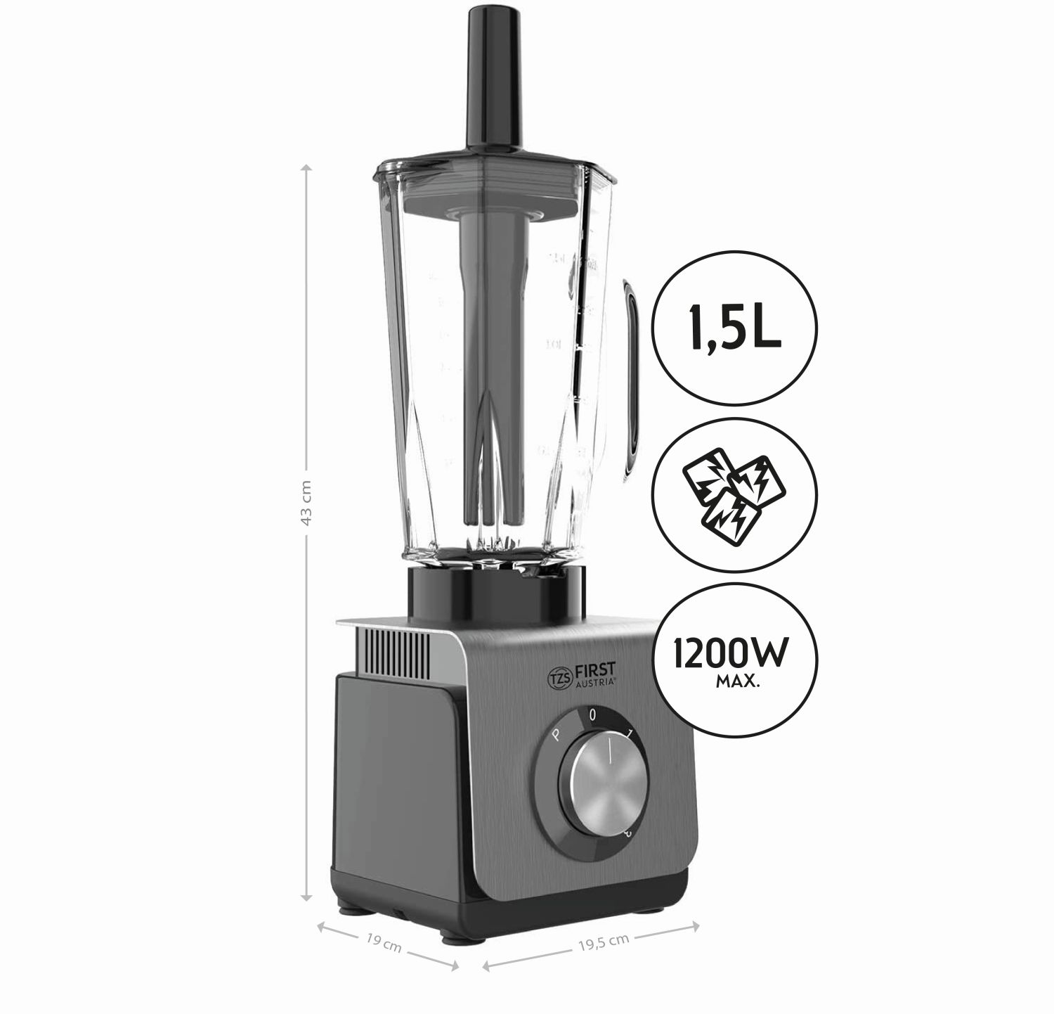 Ausgestattet ist der leistungsstarke Mixer mit sechs ultrascharfen Edelstahlklingen, einem geruchs- und geschmacksneutralen 1,5-Liter-Glaskrug mit Deckel sowie rutschfesten Gumminoppen, Sicherheitsverschluss und Überhitzungsschutz.